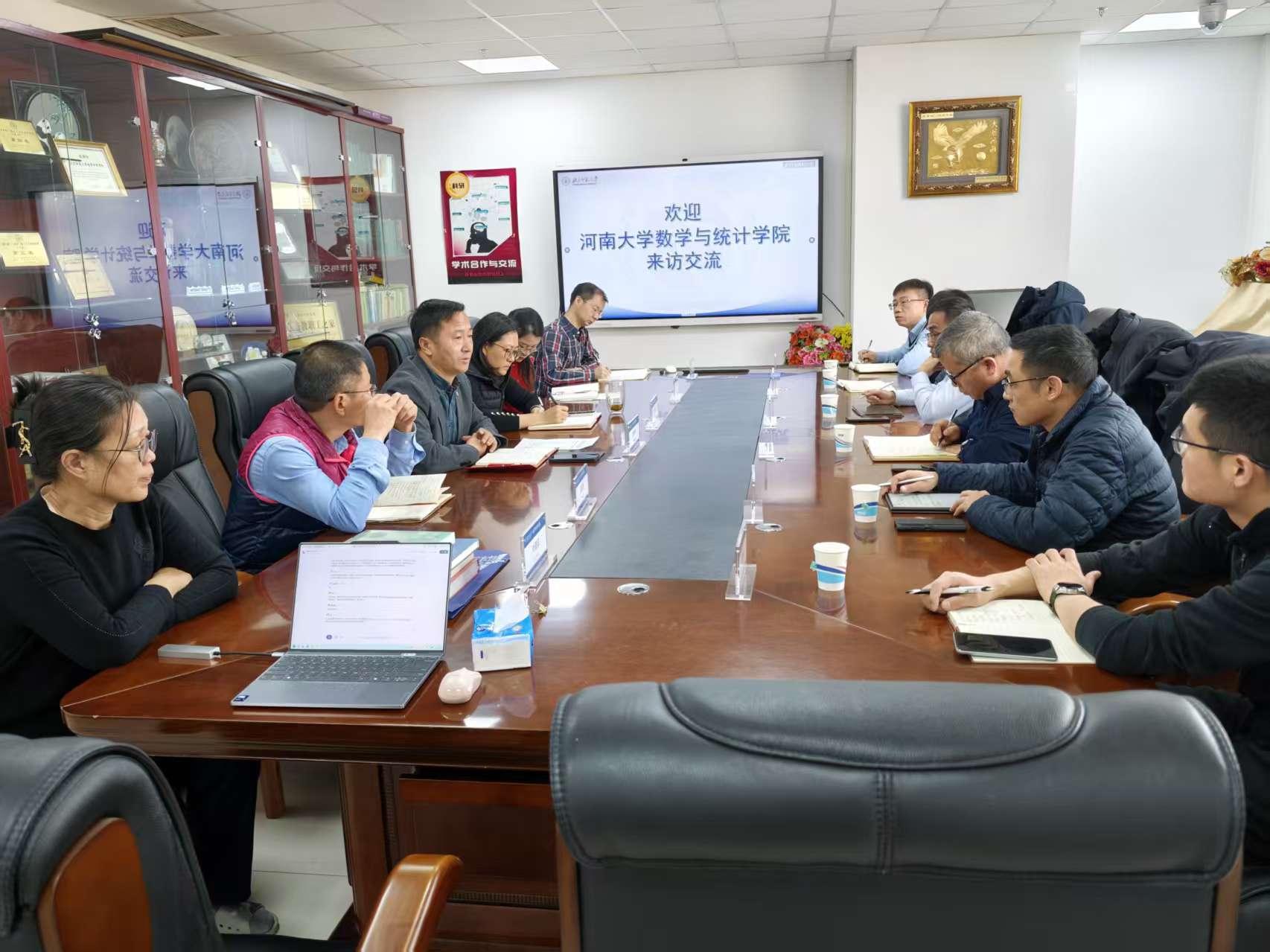唐仲伟书记对河南大学数学与统计学院一行的来访表示了诚挚的欢迎。随后,彦文娇副院长、魏炜副书记、王雨生副院长和何辉副院长分别介绍了学院在科研、第二课堂建设、研究生培养以及社会服务等方面所采取的一系列措施及取得的成果。韩小森院长对学院的热情接待表达了衷心的感谢,并简要介绍了河南大学数学与统计学院的基本情况。